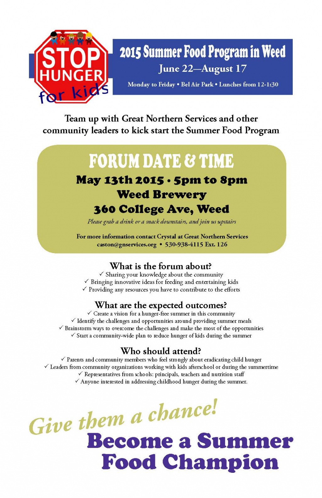 Team up with Great Northern Services and other community leaders to kick start the Summer Food Program in Weed by attending the forum on Wednesday, May 13th, from 5 pm – 8 pm upstairs at the Mt. Shasta Brewery, 360 College Avenue in Weed.