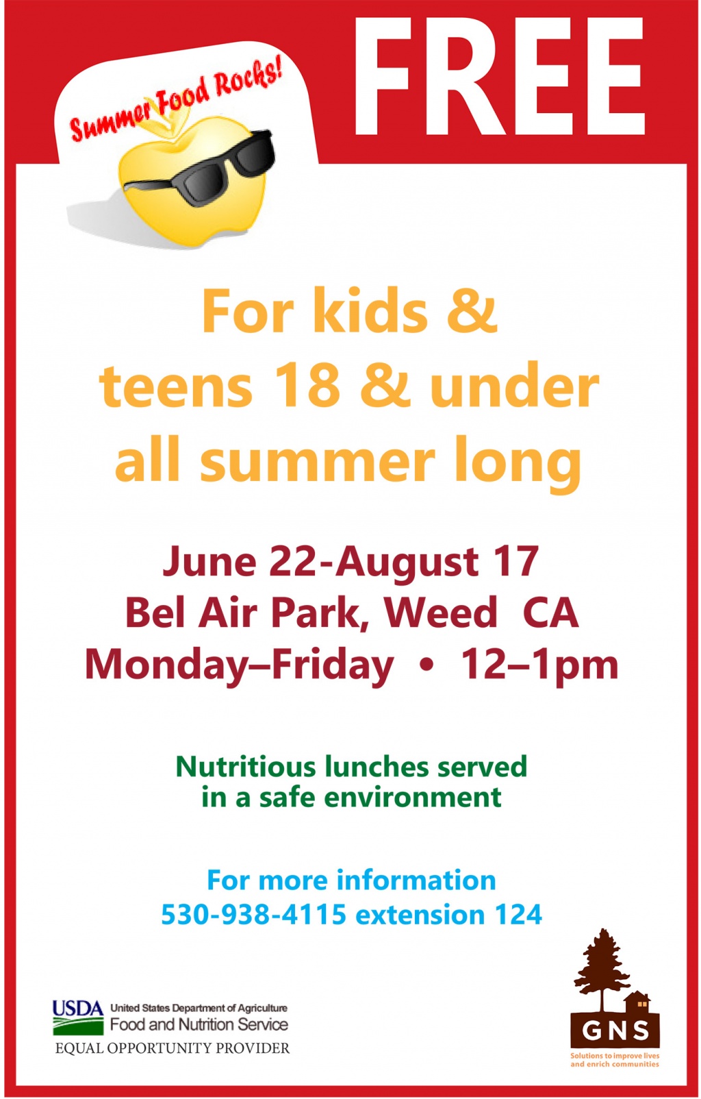 Great Northern Services (GNS) is sponsoring a USDA Summer Food Service Program in Weed beginning Monday, June 22nd. Bag lunches will be distributed near the gazebo at Bel Air Park on College Avenue adjacent to the swimming pool from noon – 1 PM Monday through Friday through August 17th.