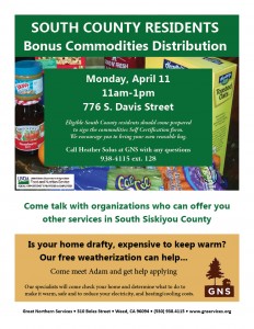 More food will reach many of the south county residents who need it most this month thanks to a bonus commodities distribution event hosted by Great Northern Services on Monday, April 11 at 776 S. Davis Street in Weed.