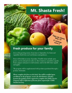 Mt. Shasta Fresh provides the free produce to participating households through the Farmer’s Market from June through September. Distribution locations will be announced to enrollees before the program begins.