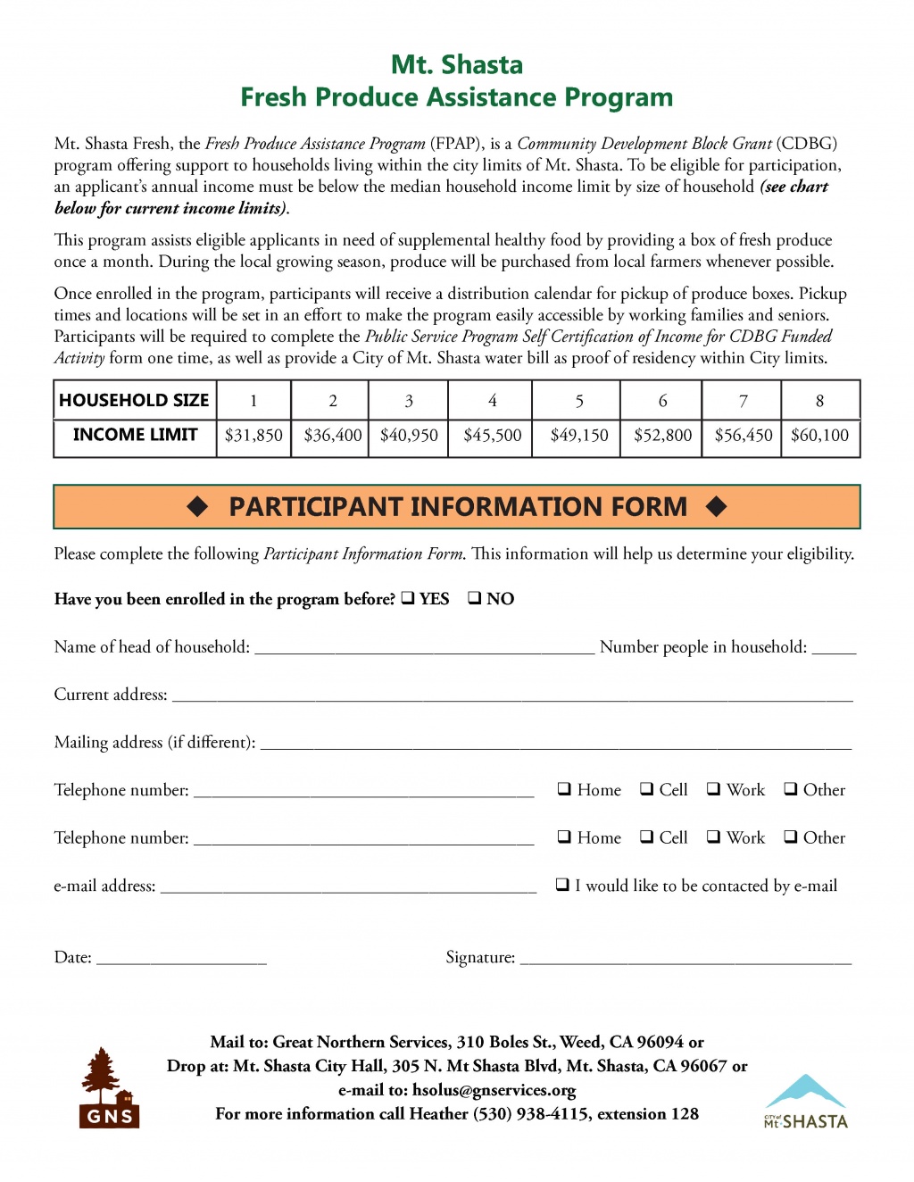 Applicants for Mt. Shasta Fresh must be residents living within the incorporated city limits of City of Mount Shasta and must meet income requirement guidelines.