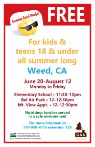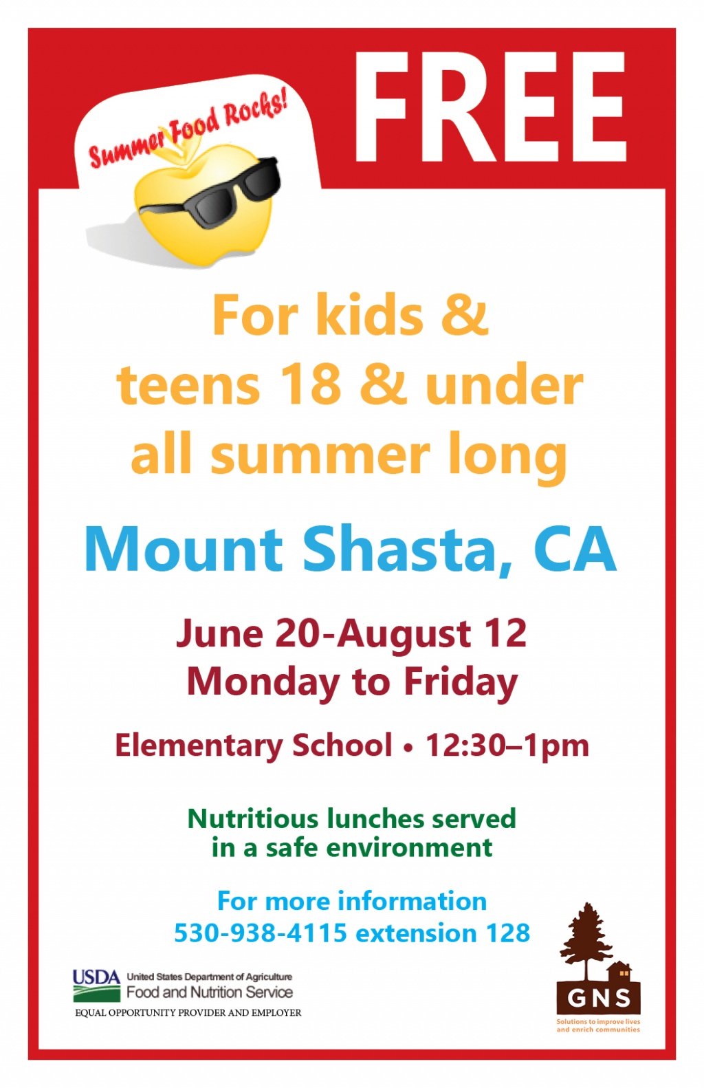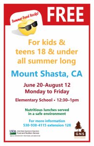In Mount Shasta, lunches will be served from 12:30 p.m. – 1 p.m. at Mount Shasta Elementary School.