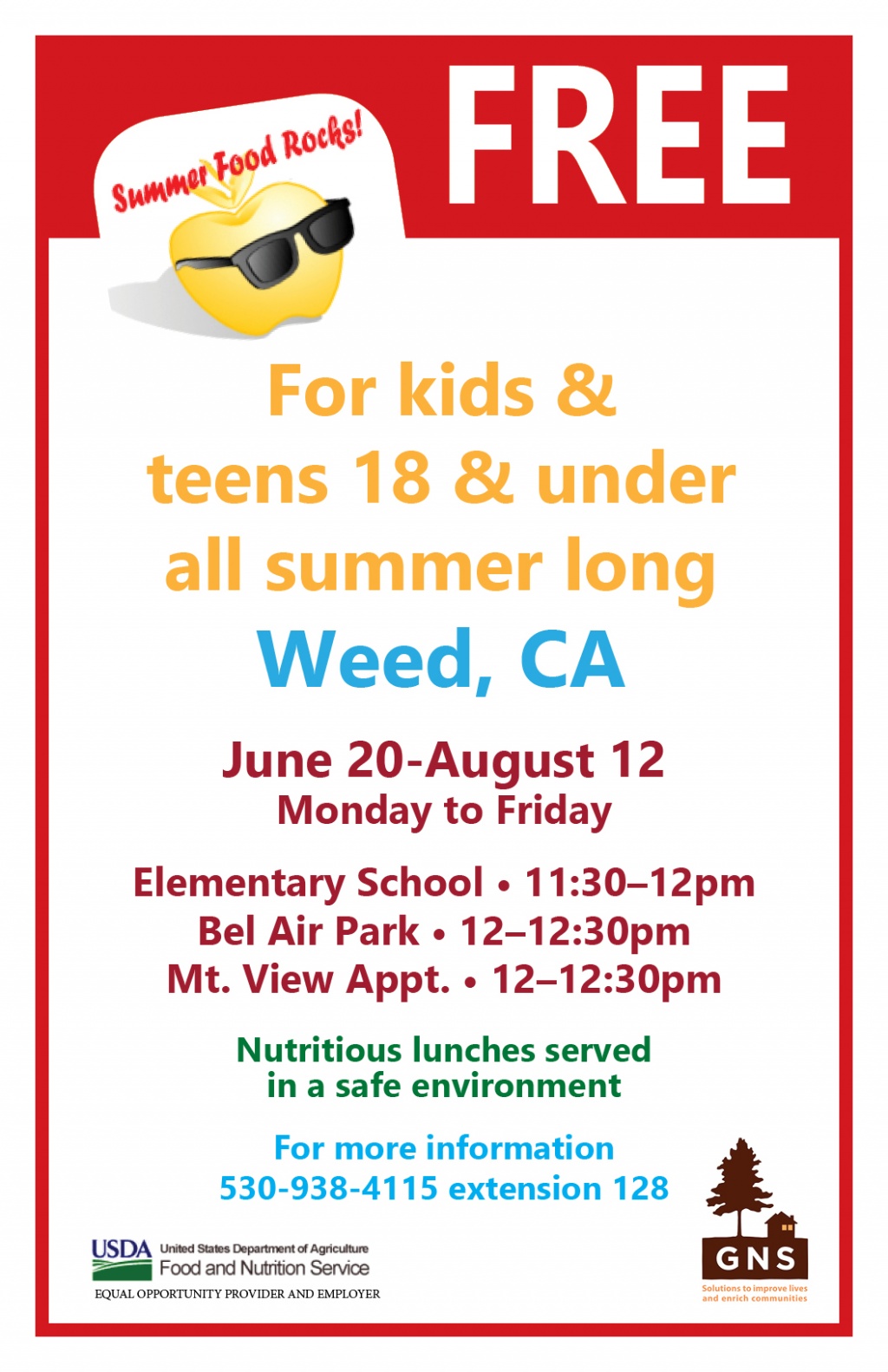 Now in its second year, the program will offer lunch at three locations in Weed and one in Mount Shasta every weekday from Monday, June 20 through Friday, August 12.
