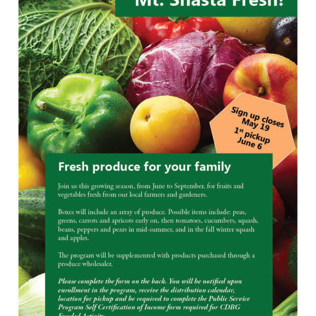 The City of Mt. Shasta is offering senior citizens snow removal assistance this winter. Qualifying senior citizens may request assistance in removal of snow from driveways at their residence. (Renters may be eligible) To be eligible you must be 60 and over or disabled and live within Mt. Shasta … [Read more...] about Mt. Shasta City Seniors: Apply Now for Snow Removal Assistance